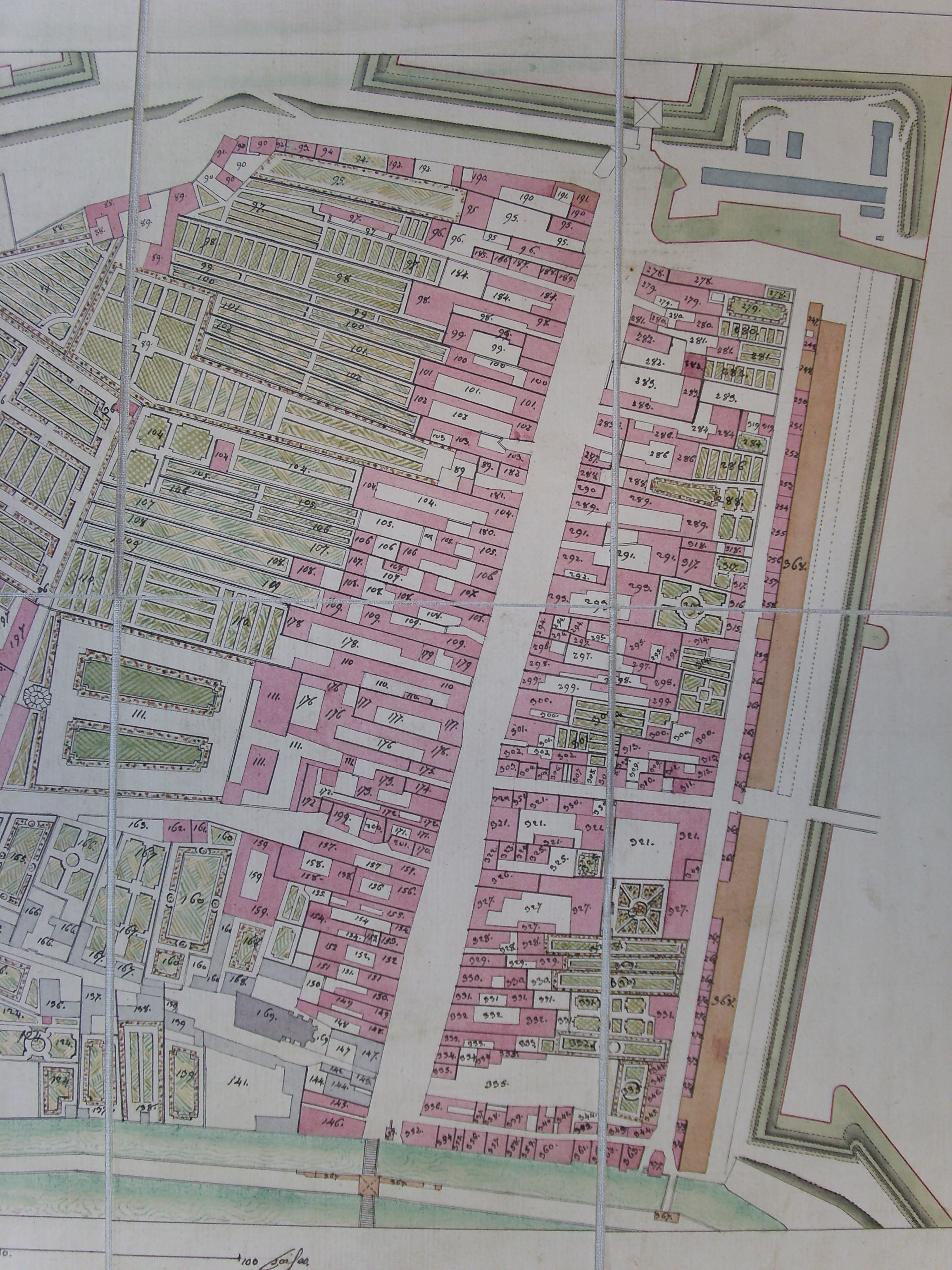 Nouveau cadastre des quartiers au-delà du fossé du Faux-Rempart. La nouvelle parcelle N 185 occupe le tiers central au nord de la rue (emplacement des actuels n° 3 et 5). Elle est ensuite partagée.